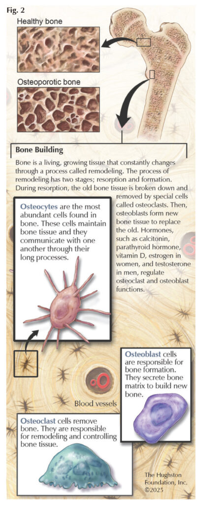 If you are diagnosed with osteoporosis or sustain a fragility fracture, the best treatment is with medications called bisphosphonates, which inhibit osteoclasts (cells that break down bone.) This allows osteoblasts (cells that make bone) to make more bone before it breaks down (Fig. 2). Remember: osteoporosis occurs when the body isn’t able to make enough bone. Additionally, individuals of all ages should take vitamin D and calcium supplements, as it is hard to obtain the full daily requirement from your diet alone.