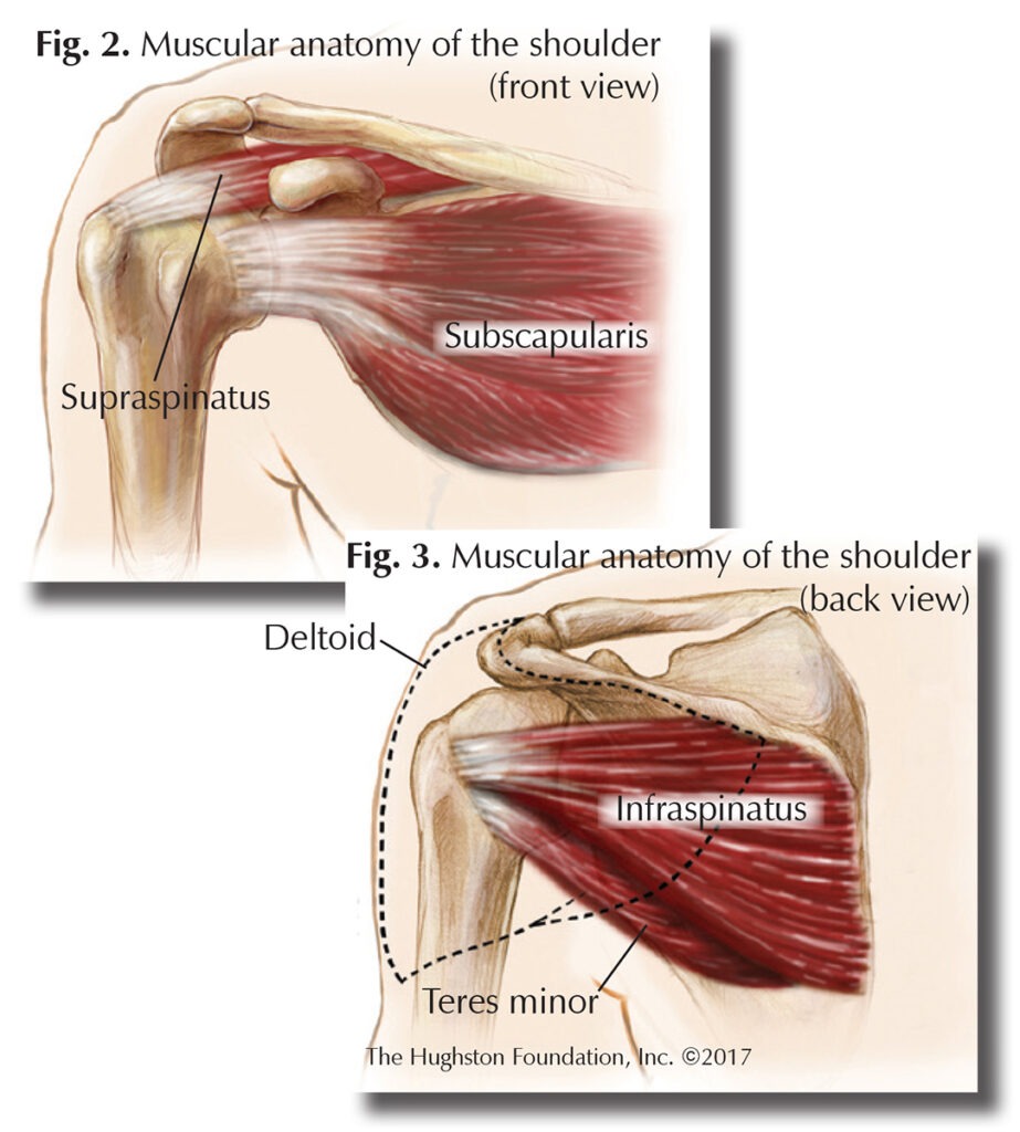 The glenohumeral joint, or shoulder, is a ball-and-socket joint. It is formed by the articulation of the head (ball) of the humerus, or upper arm bone, with the glenoid cavity (socket) of the scapula (shoulder blade) (Fig. 1). Since the cavity is shallow, there is little contact between the bones, but the glenoid labrum, a ring of cartilaginous fiber that lines its circumference, deepens the cavity by about 50%, allowing for a better fit. The joint capsule, which is the fibrous connective tissue that seals the joint space and provides stability, is very loose. This makes the glenohumeral joint the most mobile of the body, capable of flexion (bending), extension (straightening), adduction (pulling toward the body), abduction (pulling away from the body) medial and lateral rotation (turning toward or away from the midline of the body), and circumduction (moving in a circle). Because it lacks strong ligaments (tissues that connect bone to bone) to support it, the glenohumeral joint is a muscle-dependent joint. It is primarily stabilized by the biceps brachii, or muscle on the anterior (front) side of the upper arm, and the tendons of the supraspinatus, subscapularis, infraspinatus, and teres minor muscles that are called the rotator cuff muscles (Figs. 2 & 3).