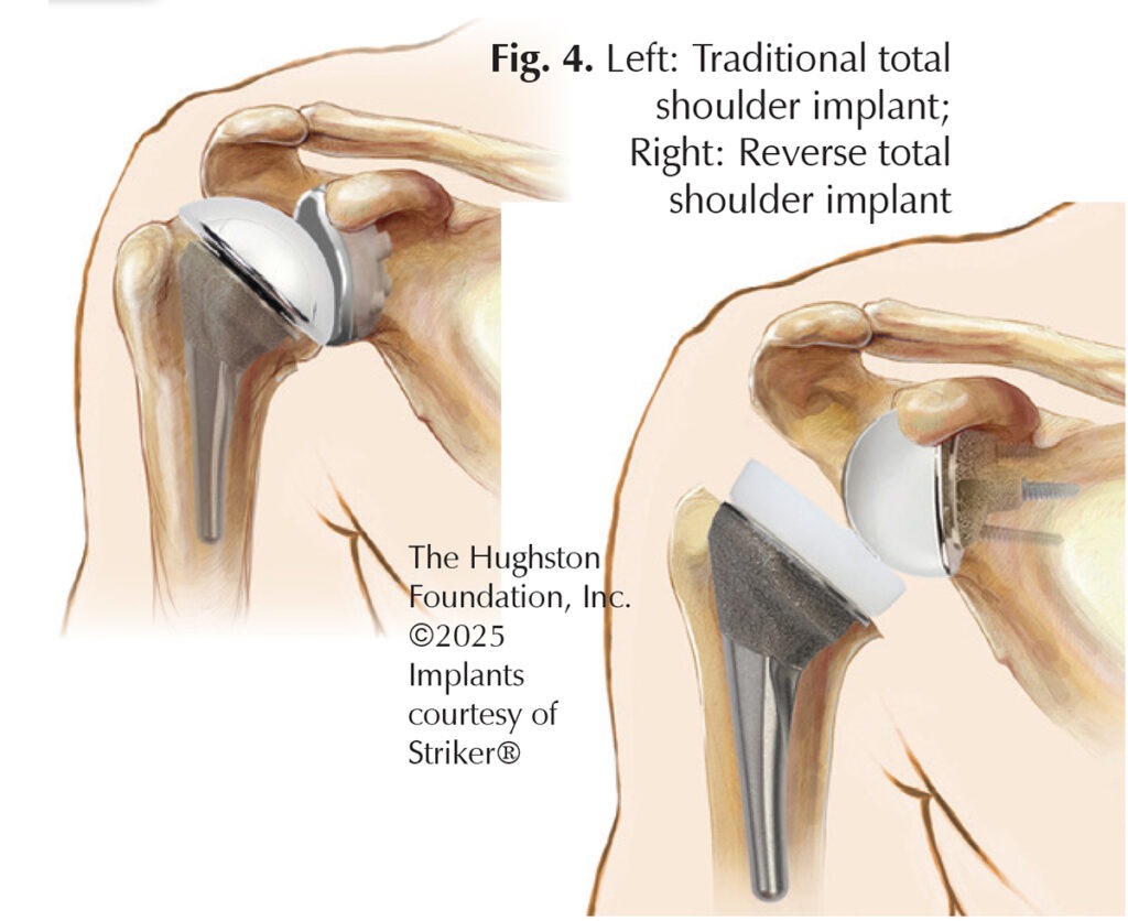 The 3 different types of shoulder replacements include total shoulder arthroplasty (TSA), hemiarthroplasty, and reverse shoulder arthroplasty (RSA) (Fig. 4). Total shoulder arthroplasty involves replacing the humeral head with a ball component and the glenoid with a socket component. It is ideal for patients who have an intact and functioning rotator cuff with good glenoid bone stock. Hemiarthroplasty involves replacing only the humeral ball of the joint with a component. It is ideal for patients with severe proximal humerus fractures, inadequate glenoid bone stock, or a deficient rotator cuff. Reverse shoulder arthroplasty includes replacing the humeral head with a socket component and the glenoid with a ball component. It is ideal for patients who have rotator cuff damage, elderly patients with proximal humerus fractures, and failed previous shoulder arthroplasty; however, it is essential to have a functioning deltoid muscle and axillary nerve to function properly.